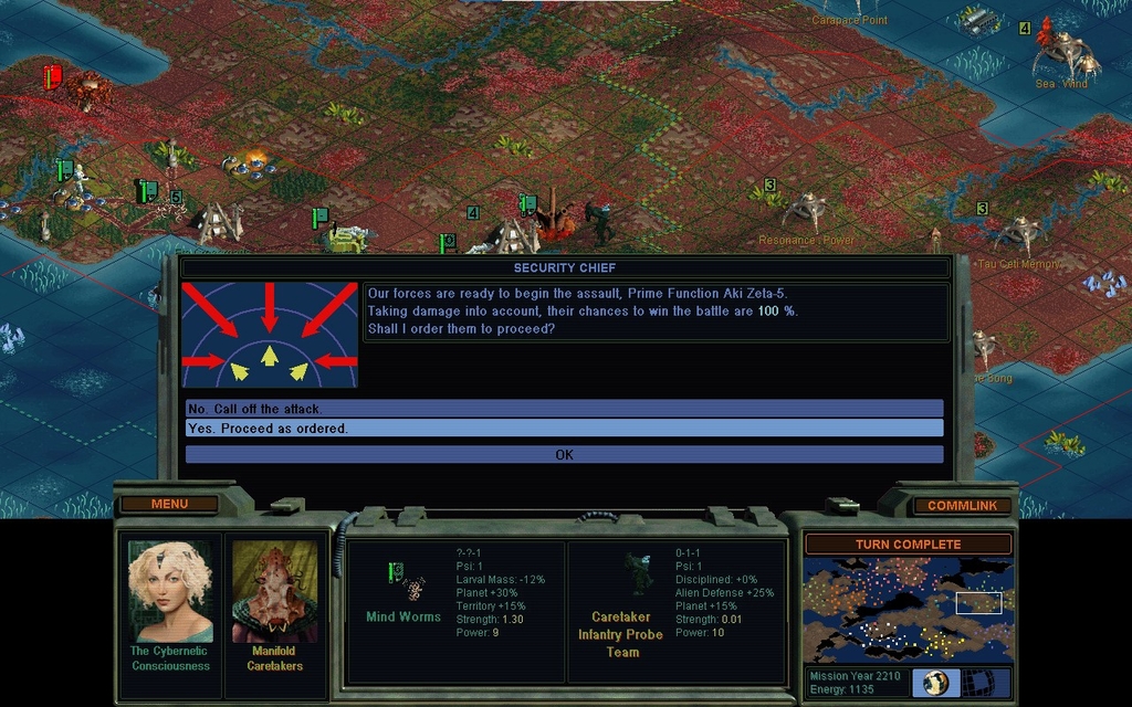 MY 2129.  This is supposedly my last turn of half strength mindworms.  It's an opportunity to test the odds.  However I don't really need to fight, because my mindworm can kill the "back door" and give the Rover a route of escape.  Still I will save the game, and repeatedly see what can be done.