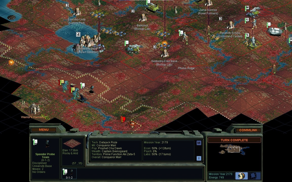 I can't afford the maintenance on any more facilities.  I make Fungicidal Rover Formers nearly everywhere because they don't cost credits to maintain.  If I make enough of these things, eventually I'll be able to make better improvements or raise land bridges to enemies.  Doesn't look like I'll need to build roads to anybody like I first thought, as Deirdre will surely come to me.  Meanwhile I'm working on basic homeland improvement.  So far I've only managed to sustain bases of size 5.