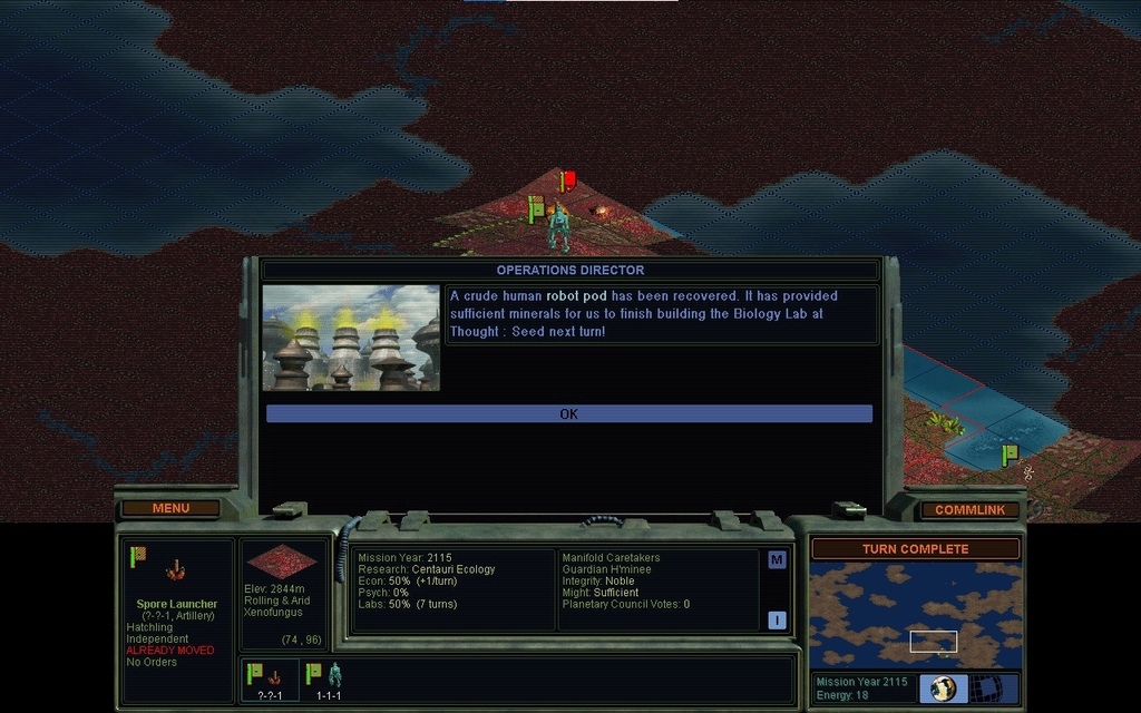 The Caretakers also interloped and exacerbated my situation with a few units.  However they've had no stick-tuitiveness about it, so things got back to quiet.  I'm using the remainder of my Scout Rovers to wipe out fungal towers near me.  Some of my bases are at size 6 and when they go to size 7, I'll get an unhappy person, so I make a colonist.