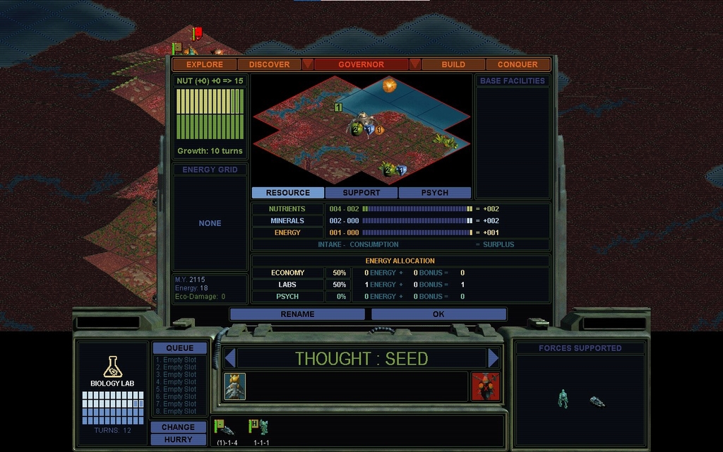 I've got 4 units and no SUPPORT issue?  This is new.  I remember that being talked about, but I was busy with my own modding at the time.  Well, we'll see.  I wonder how long I can crank out the units?  I'm not opposed to getting a bunch of Formers in a hurry, it's pretty much standard drill with my own mod's Clean Formers at the beginning of the game.