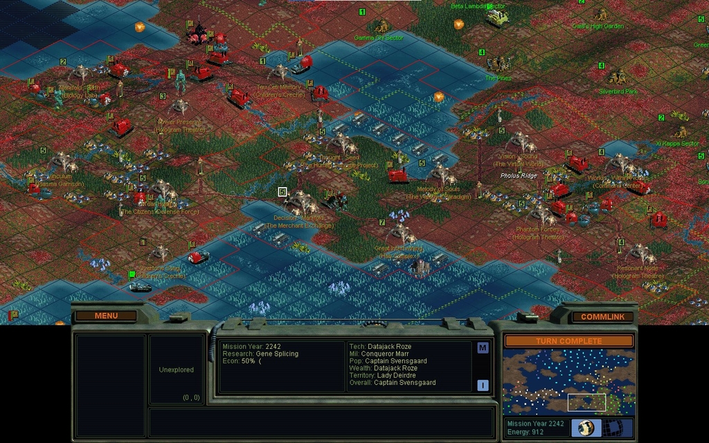 The seaward orientation yielded the reward of coming into contact with all of the other factions.  This year in a flurry of comm sales, I became Governor.  I also got maps for most stuff.  For some reason I parted with D3 Intellectual Integrity to get one of the maps, I guess because I have a hard time valuing any of these early techs as important.  Usually I wouldn't do that, and maybe I didn't even have to, as one of my new allies might have been able to get it for me.  Oh well, whatever.  Brain got a bit soft.