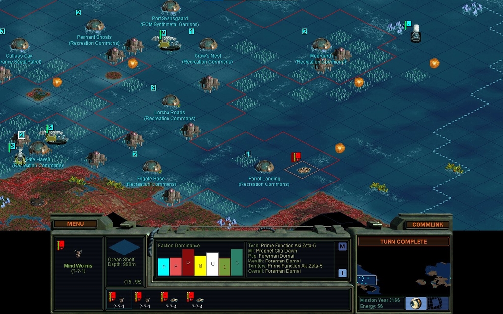 Trance units seem to be currently the only valid untrained defense for the Pirates.  I was actually starting to garrison my sea bases with Trance Scouts, but they all had to come from 1 base and I've only got 1 Transport.  It's not that I have a Command Center there.  I surely don't have the minerals to justify any such thing, nor would I likely have had time to complete it.  Nor a Naval Yard; I don't even know how to build one of those yet.  The thing is, everyone's tied up just trying to get the bare essentials going, a Recreation Commons.  We're that poor.  All this food is worthless.  And you can't really make any money on tidal harnesses, because you have to spend your first 2 squares on making minerals that you don't have.