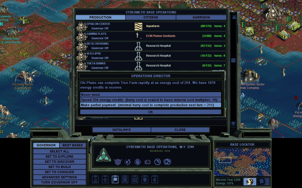 I am becoming concerned that there's not enough time, before the end year of 2500, to actually do much of anything.  I have deliberately avoided making Genejack Factories due to my historic fear of the entire Planet going glub glub glub underwater.  But I'm so minerals poor compared to other factions' colony output, that I'm wondering how the units would ever get made to clean them up.  It doesn't help that singular attacks on a base just result in another Trance Scout being immediately spammed.  It's got an almost video game arcade like sensibility in that regard.  It means that even a big ship with a big gun, is obstructed and delayed.  I saw Lal working on a Copter chassis, but I haven't got those techs yet myself.