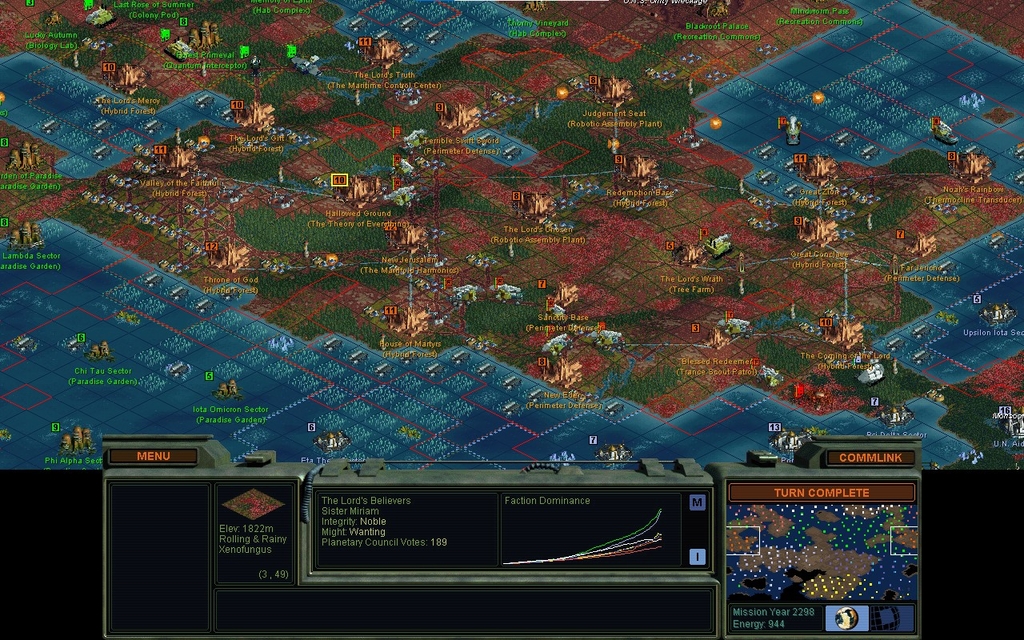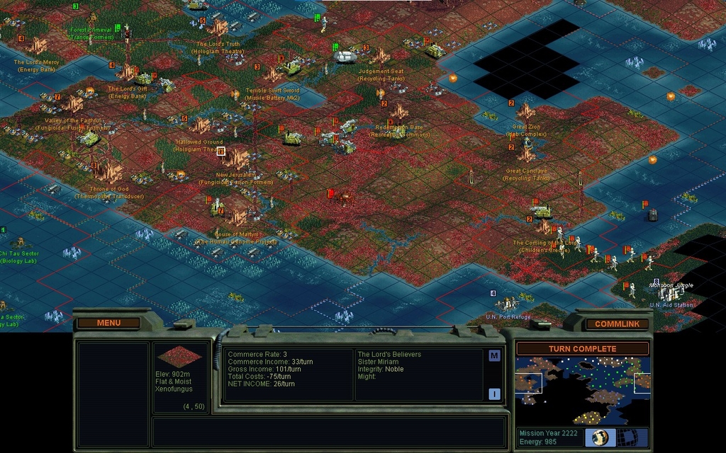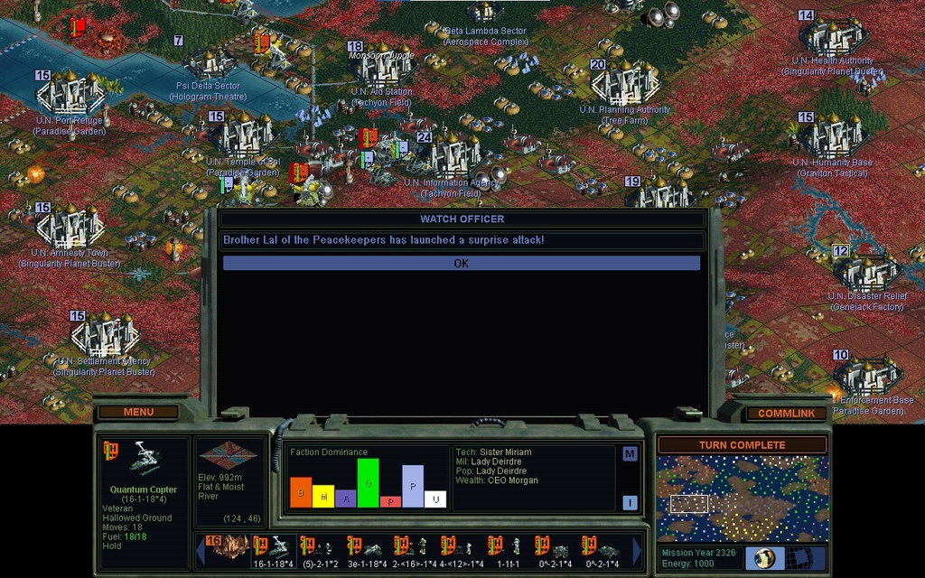 Like, after all this time, is it trivial or exceedingly difficult to wipe out Lal?  I'd like to think that genetic plague + X String Choppers will reduce him to nothing, but who knows.  I also have a lot of weak Empath units for taking out pesky mindworms, at least in isolation.  I don't have any decent gun Empath units because those are more expensive to build.  TBH I thought I might have to fight my ally Deirdre, after I changed from Green to Planned.  Now I'm back to Fundamentalist Green Power Cybernetic, so she'll be happy if the sunspots lift.