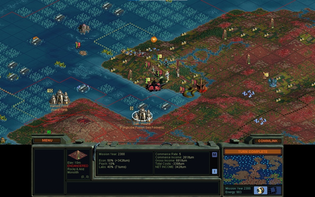 We were in sunspots for awhile, so I lost the habit of talking to my allies.  Eventually they lifted, but I still didn't check in.  I got the impression that they've gotten somewhat farther ahead on tech.  However I've had no reason to care, as my existing equipment and techniques have worked just fine.  I didn't even build any new units for awhile, I just kept on working on things like Tree Farms and Genejack Factories.  Even Habitation Domes, for lack of anything better to do.  I have 1 city with a Command Center and it would make the occasional X Chaos Speeder.