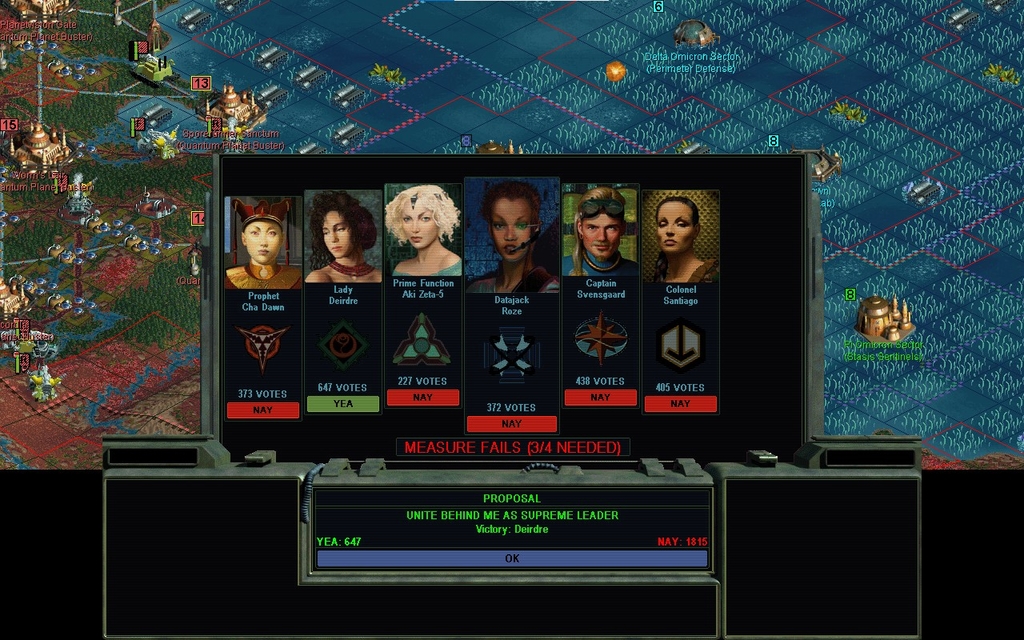 Now, why haven't the Gaians or Pirates made a move on the Governorship?  Perhaps they're each afraid that the vote could go the other way.  And they'd each rather have weak Roze as a Governor, than the other one strengthened?  Except that I think until fairly recently, they may have been allies.  I haven't been paying a lot of attention to that, long as nobody is asking me to get into their wars.