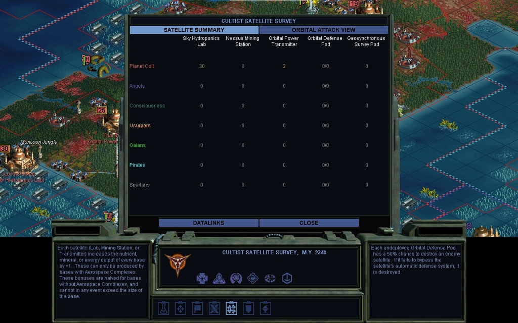 MY 2348.  I have completed the Singularity Inductor.  So far no eco-damage.  I've built as many Sky Hydroponics Labs as my cities can realistically use for the time being.  My biggest city is size 30, and I'm pretty sure the rule is, you can't use more SHLs or OPTs than the size of the city.  I've been switching to Orbital Power Transmitter production.  I've realized that more money means more to spend on Secret Projects.  My next one is the Telepathic Matrix.
