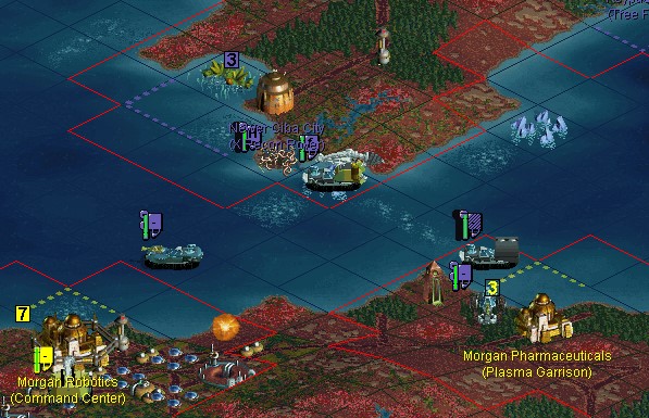 MY 2208.  Although I did kill a city or two, the Morganites have repelled my initial flurry of units.  I did not land them in an organized fashion, and terrain was disfavorably arranged in horizontal bands along my line of advance from the beach.  Morganite Rovers spammed me and picked me off.  I will either need to operate much more amphibiously to not have to deal with this, or I'll have to make a more armored incursion inland.  I suppose I should be glad that my mod is capable of putting up some resistance.