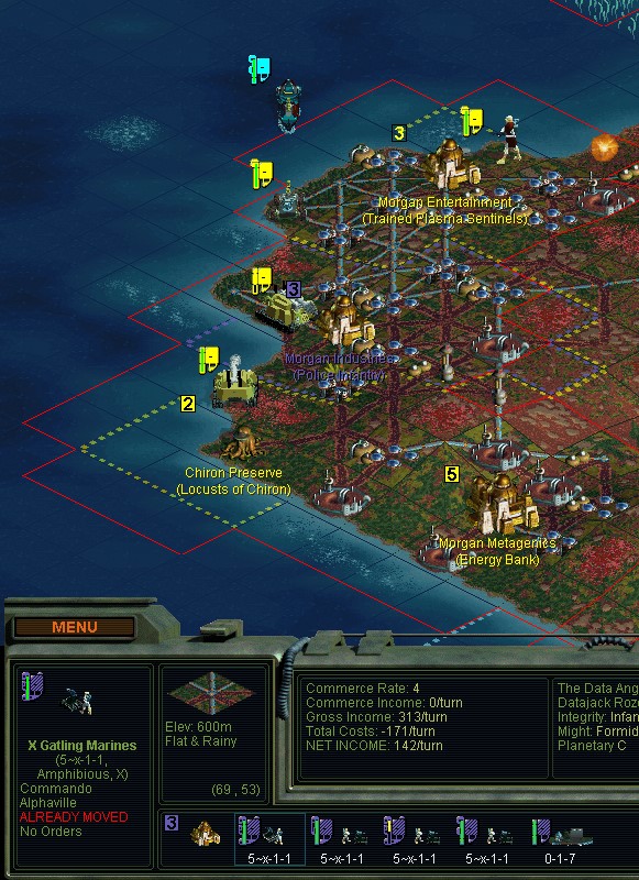 Morgan Metagenics is defended by a nearly dead Clean Trance Scout.  I could destroy the city if I could just get units down there to do it.  It's just barely out of Needlejet range.  I suppose I could build a Carrier and move in and out of port to slightly extend my range, but sending my existing X units is faster.  I tried to ride the rail lines this turn, but enemy units were in the way, so I got back on my boat.