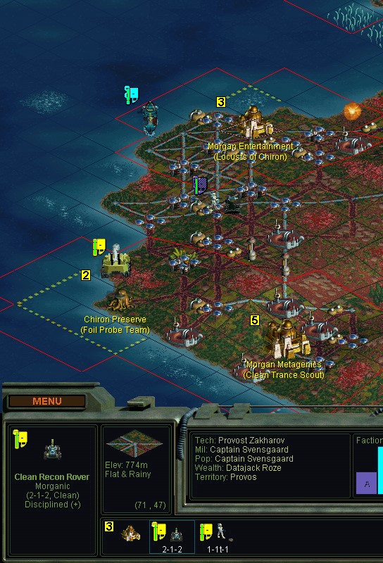 Belatedly I realize that the Cyborgs are close enough now to infiltrate by land.  I have extra AAA Trance 3-Res units, so I send one of them into the fungus to prepare the way for a probe team.  It encounters a Morganic speeder, which I have to take out with a mindworm.  And it stirs up a native mindworm, so again another mindworm.  Finally I run into a Cyborg Scout.  This is a busy patch of fungus!  It seems that minor atrocities aren't so implacable to the unaggrieved after all.  It'll last until, presumably, my next chemical attack.