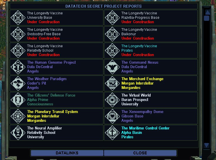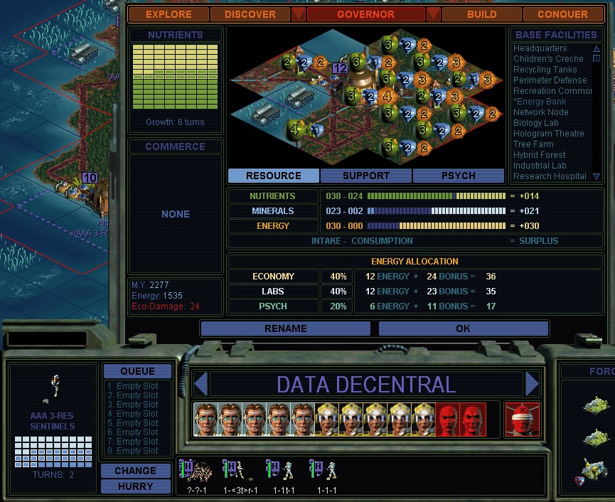 MY 2282.  The Pirates start building the Longevity Vaccine, giving me more motive to steal from them.  I get 2 pops but thankfully they're the ground stack kind.  I rise to 1472 credits killing them.  I rush 3 more labs, leaving me with 812 credits.  My capitol is still doing 28 eco-damage.  Once I've got troops, if the mindworms are still at it I'll build Centauri Preserves.