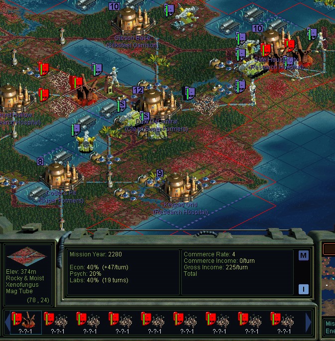 MY 2280.  I get 2 fungal pops.  The western clump has a stack.  The eastern one doesn't.  I start the year with 1301 credits and 18 eco-damage in my capitol.  After killing the mindworms I have 1901 credits.  Perhaps I don't need much of an ECONOMY right now.  However, changing to Police State or Extremist drops my income from 50 to 21, without obviously providing much advantage.  I stay Democratic.