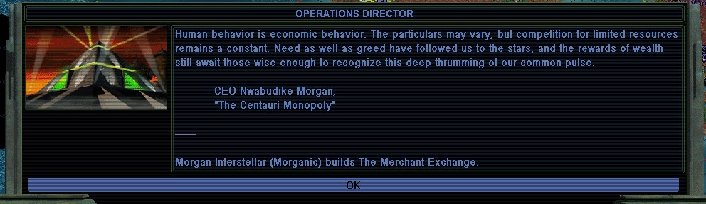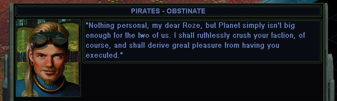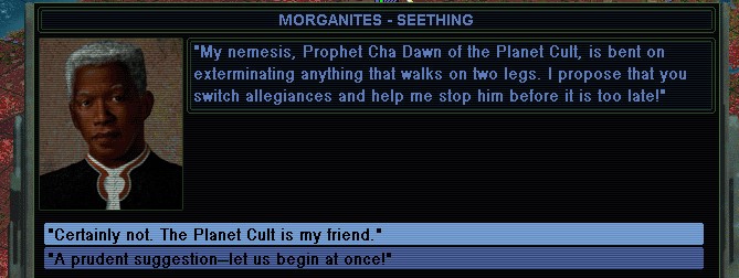 I contact Morgan, hoping to sell him Zhakarov's comm frequency.  Maybe Morgan can get a map out of Zhakarov?  Actually that wasn't a well thought out idea, since Zhakarov has more tech than Morgan.  Anyways, Morgan isn't interested and just wants to yabber about how much he hates Cha Dawn.  I rebuff him.  Out of curiosity, I contact Morgan over and over again, and each time I rebuff his attitude towards me gets worse!  He rapidly goes from Ambivalent to Obstinate to Quarrelsome to Seething.  I hit him like this 10 times in a row at least, then I stop bothering.  I would have thought our interaction would be terminated, and it would have been more sensible for my refusal this turn to count as 1 ding against me, not an infinite number of them.  But pissing him off does have its uses.  By the time I get my probe team down there, perhaps he'll be in a mood for war and I can just steal tech from him.