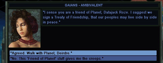 The Cult of Planet signs a Treaty.  In my mod they are compelled to be Extremist.  They will hate my Police State once I eventually get it, but I'm just a Frontier society right now.  They're at war with my allies the Morganites, but I don't have a reason to care as that alliance won't last.  I ask them about comm frequencies but they don't have any.  I don't care about their tech, and they didn't have any anyways.  I sign off before I even have to.