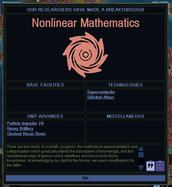 I stole C5 Superconductor from the Morganites.  Marine attacks with bigger guns are probably the key to breaking Morgan's back.  The sea hasn't been contested much, perhaps because the Pirates, the Morganites, and the University are all at war with each other.  The Pirates did complete the Maritime Control Center.  I couldn't afford to go for it.  I'm pretty happy with what the Xenoempathy Dome has been buying me on land, and the money from the Planetary Energy Grid is handy.