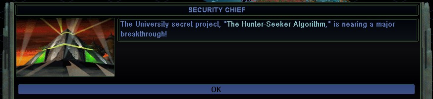 The University finally finished the Hunter-Seeker Algorithm.   Unfortunately now everyone wants to build the Planetary Energy Grid, same as me.  I'm not really making any money from exploration anymore.  My economy isn't that strong, only 18 credits / year.