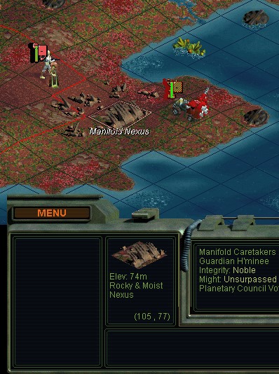 A mere 75 meters before it was going to sink, I raise the Manifold Nexus.  Only to discover... it gets destroyed by raising it too!  I'm down to +2 PLANET now.  I don't know if my Farm helped it disappear or not.  I suspect the Nexus is a terrain feature rather much like the Monsoon Jungle, capable of going <poof> if the land is raised.  Which is, like, completely and utterly stupid.  I thought having it drown was bad enough, but this, this is ridiculous.