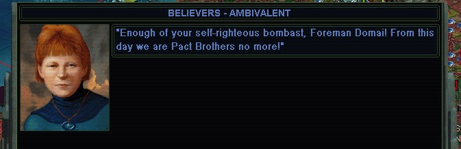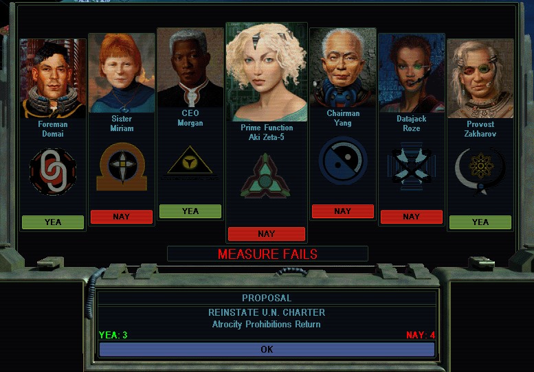 ...Repeal the U.N. Charter?  Boy, if one is serious about winning, it's the obvious way to go.  Think of a world with No More Morgan.  It just seems like such an easy exploit though.  Well, why not demonstrate what X Lasers can do to another faction?  Assuming it passes the Planetary Council.  If it doesn't, the Sanctions are really bad, and Planet's vengeance is not something you want to experience lightly.  Yeah, Planet gets peeved according to what the humans decide is legal or illegal, go figure.  I say it's a bug, or a serious design oversight.  Probably has to do with how they tied everything into the economics system, since the Alien factions aren't affected at all.
