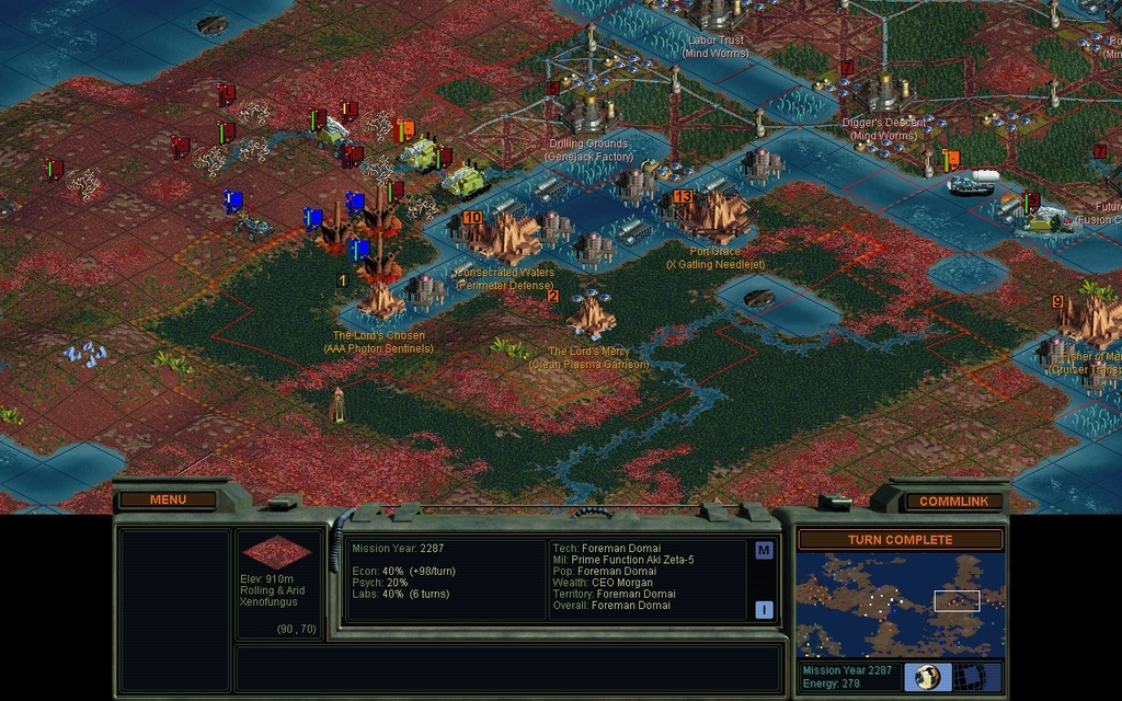 MY 2280.  The Hive kicks the Believers out of the Monsoon Jungle.  I wonder if they've been using chemicals and that's a depopulated base?  I do see Miriam making an X Gatling Needlejet nearby.  Well I'll see if I soon have surplus Colonists from anywhere.  I'm spending 20% on PSYCH lately, so I've got more room to go vertical.