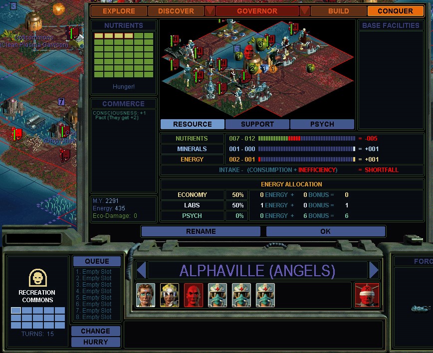 I finally switched to Knowledge.  For the longest time I was only Democratic Capitalist, because I didn't want any of the disadvantages that the Values choices would give me.  Now I've accepted the loss of police units, in exchange for a better PLANET rating.  I'm a little annoyed that I just made a few expensive AAA Probability Police units, but at least I didn't do it everywhere, and I'll get over it.  I don't have quite the money coming in that I used to, as I'm putting 20% into making people happy.  So, not really any money for unit upgrades at present.  Not a problem yet, as Roze is the only truly nearby enemy and I'm clobbering them.  Their X Needlejets are gradually getting killed on the ground.