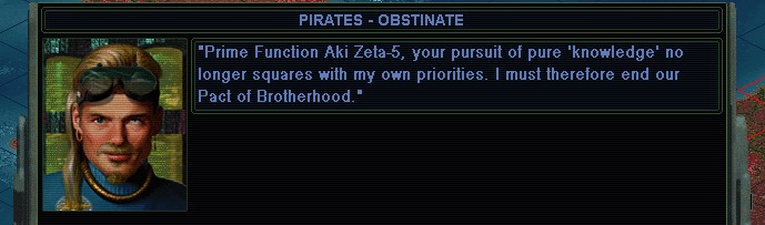 I figure he's about to declare war on me, but surprisingly, he offers a Treaty.  I don't care about him, I have 2 land enemies to deal with up north.  I buy the tech from him.  I ask him to stop warring with the Pirates, so that he won't be more and more poorly disposed towards me.  He complies.  It may not do much good since he hates my Politics, but there's a chance he might, especially if he gets busy warring against the Caretakers.  We do have that common enemy.