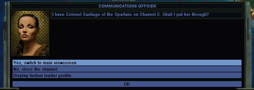Santiago ignored me, so I proceeded with my original plan to trash her sea base.  That was how I was going to steal the MCC, since I'm Borg like that.  Well, now that she's about to get trashed, she deigns to talk to me.  Is she going to say something ridiculous?  She and Roze aren't friends anymore, they're fighting.  Well that was weird, I didn't even get a chance to speak.  She just told me to take a good last look at my empire.  Ok Santiago!  Nobody likes you, and the only reason Svensgaard has a Treaty with you, is I'm too soft to ask him to trash you.  I'll just do it myself!