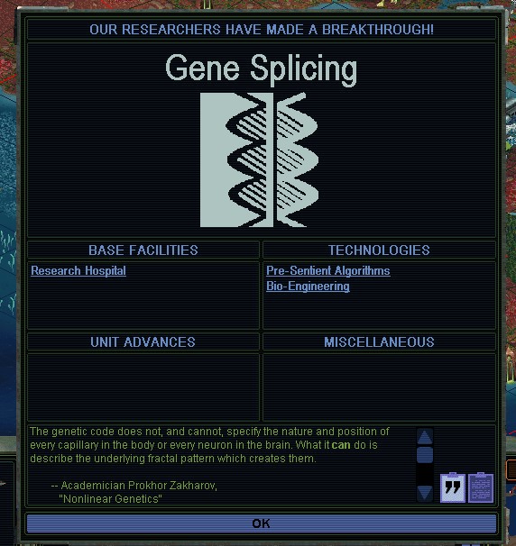 The game read my mind.  YES I'd like to change my research focus.  Enough of that other guff!  Time to get back to what Cyborgs are more supposed to do.  The moral of this story is it took 123 years to figure out Fungicidal Tanks, and I'm not the one who figured it out.  Just not worth the bother.  Better to accept that fungus will be a barrier for quite some time, all through the early game in my mod.  Whereas, building roads through fungus can be done fairly quickly, due to Centauri Empathy only being a Tier 2 tech.  There's a huge time lag between Tier 2 and Tier 3 in my mod.  And even Tier 2 has gotten pretty big over time.