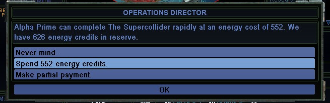 MY 2309.  I decide to ensure that I get the Supercollider.  I spend 1 Artifact and cash to rush it.