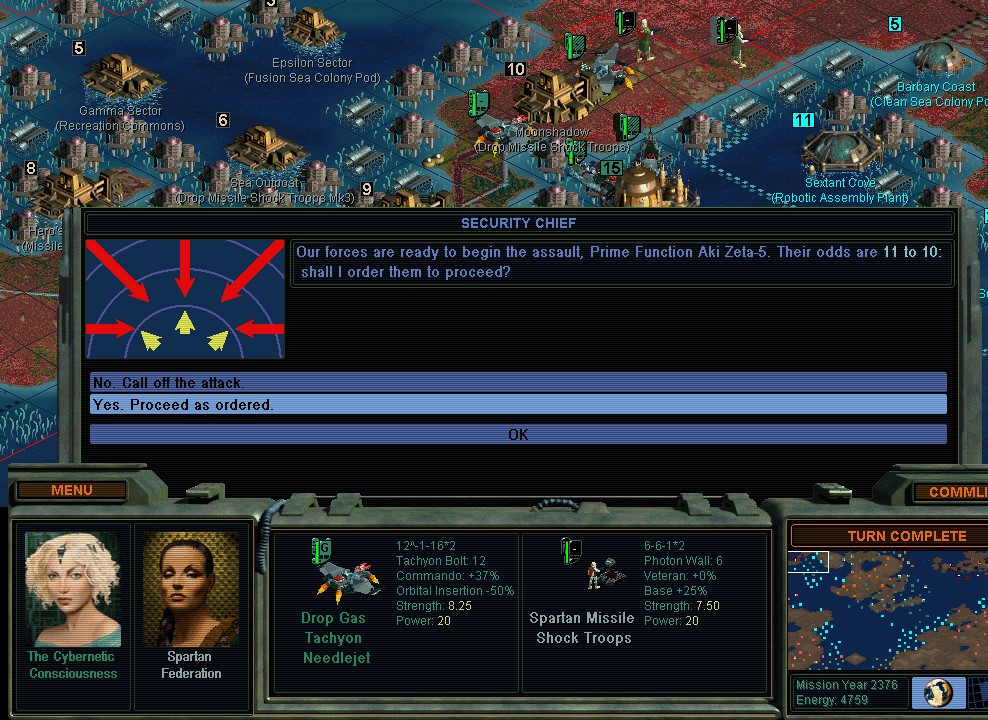Oh shoot.  I screwed up.  I needed that Isle to move the Marines for the assault on Moonshadow.  I was worrying about ship and base transfers, and though having that Isle out of the way as my Transport came up, would be an advantage.  I miscalculated.  I'm in position to attack next year, but by then it probably won't matter.  I bring up a ship to cover my wounded Isle and shell the Sensor Array, forgetting that there's a battery in the city to keep me from doing that.  Oops.  I'm out of sealift now.  Need the rest of my boats and Isles for base defense.