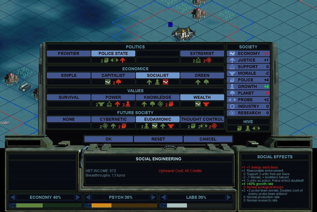 MY 2413.  I switch to Socialist, which surprisingly only cuts my income by about 100 credits.  Combined with my faction ability, I now have +4 GROWTH.  My Hab Domes are all completed, so this is a pretty good time to start cranking out the citizens.  I'm sure I could have done everything much sooner, but there's this sort of inertia, having been traumatized by the planet flooding for so long.  I anticipate needing roughly 1200 votes and I've got 810.