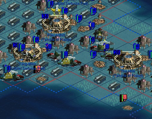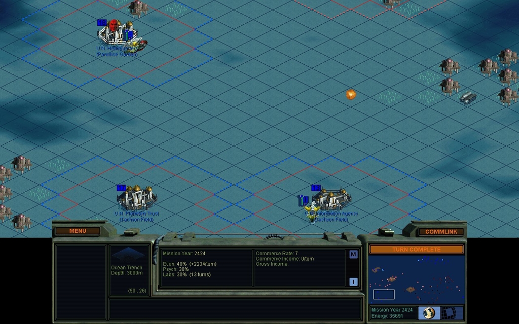 MY 2416.  I had a fungal pop this year, and I lost a lot of ships trying to figure out how to harvest the stack of Isles.  Eventually I got it and made 840 credits, but I lost one of the expensive Tachyon ships, thinking too much of its capabilities.  You'd think with Air Superiority it could just shoot at a Locust directly, but it died.  The 2nd version of that ship, I shelled the whole stack, doing the top Locust some damage.  The other factions keep bothering me with Isles, but they just suicide on my Cruiser Formers.  You'd think the AI could be a little smarter about attacking Trance 3-Res units.