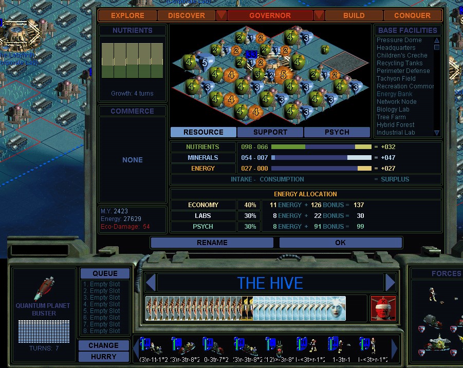 I had forgotten about the orbital minerals cheat.  Now maybe it's debatable whether it's a cheat or a simulation.  Mineral extraction on asteroids might create a lot of space debris, but it wouldn't have a direct environmental effect on Planet.  Transporting those minerals down Planet's gravity well is probably not particularly polluting.  However, vehicles do have to come back up the gravity well again, so I don't think their movement is environmentally cost free.  A more detailed simulation would have you stockpiling the chemicals needed to drive cars or launch rockets, and you'd do the eco-damage wherever you're extracting those chemicals.  Emperor of the Fading Suns had that level of resource representation, but didn't have eco-damage as a game mechanic.  I suppose you could avoid all extraction costs in Planet's environment, if you dropped enough chemicals from orbit, sufficient to get rockets back up again.  Of course, there is the environmental cost of burning the chemicals, which isn't modeled in SMAC.