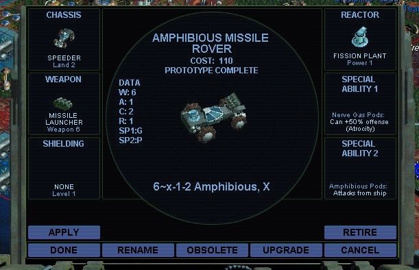 I lose an X Missile Rover to the Isle.  My next attack is against a regular unit.  The odds were pretty much in favor of them, so I canceled the attack and switched to chemicals.  I figured the base can survive more hits.  It drops to size 4, so I guess a Research Hospital doesn't do anything against chemical warfare.  I won't be able to do that again, but eliminating that defender is probably all I need.  I lose another X Missile Rover to the stupid spore launcher.  Finally my units get through.