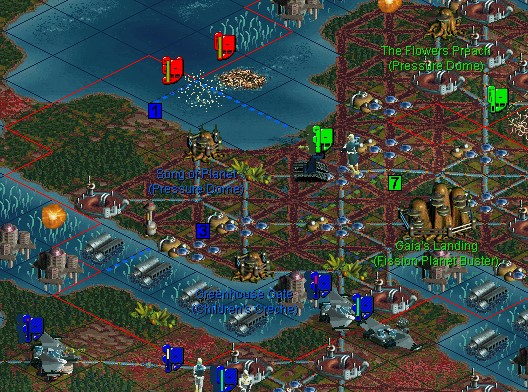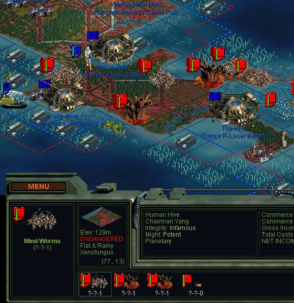 I have nearly cleared the mindworms from my land.  I am no longer bothering to make military units.  Instead I'm making Trance 3-Res Cruiser Transports to move existing units around when everything inevitably sinks.  My westernmost bases are making Trance 3-Res Cruiser Formers to start working on sea minerals.  Fortunately I'm getting 1 mineral from fungus squares, so I'm not likely to become desperate.  My 3 landlocked bases are making Flechette Defense Systems, for lack of anything better to do.  As much as I might like to improve my factories, I'm not done doing eco-damage yet.