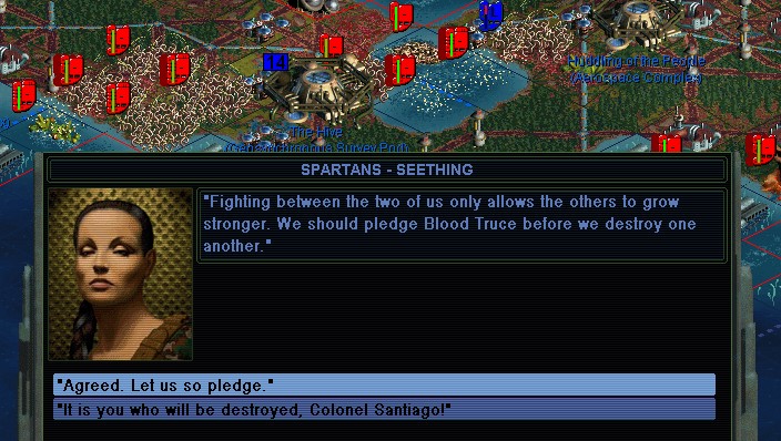 My Truce with Santiago lasts all of 5 seconds, as I can't very well stop killing the Gaians while I'm still able to.  I'm able to reduce the Gaian sea base to size 1 and empty it of defenders, but I can't quite destroy it.