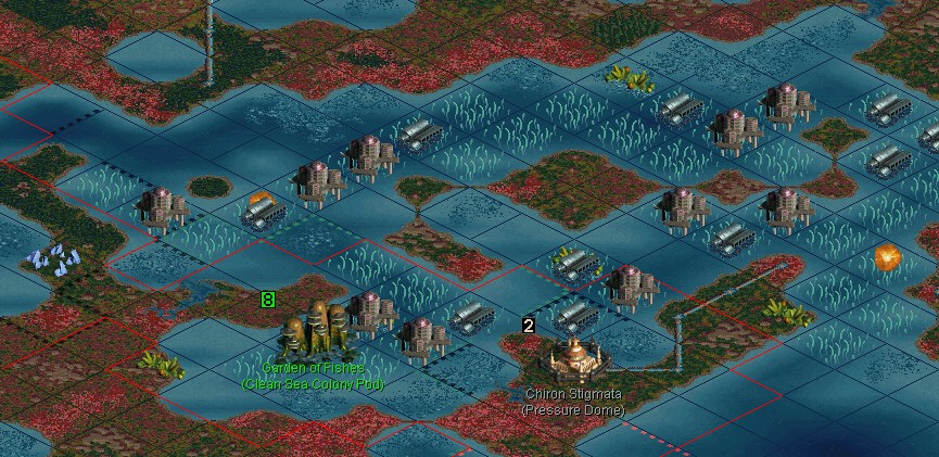 MY 2330.  No fungal pops this year.  Only a few straggling spore launchers, mindworms, and fungal towers left.  Only 1 city doing 7 eco-damage, another doing 2, all others 0.  The blight has passed.  I need to build kelp and minerals in the rapidly rising waters.