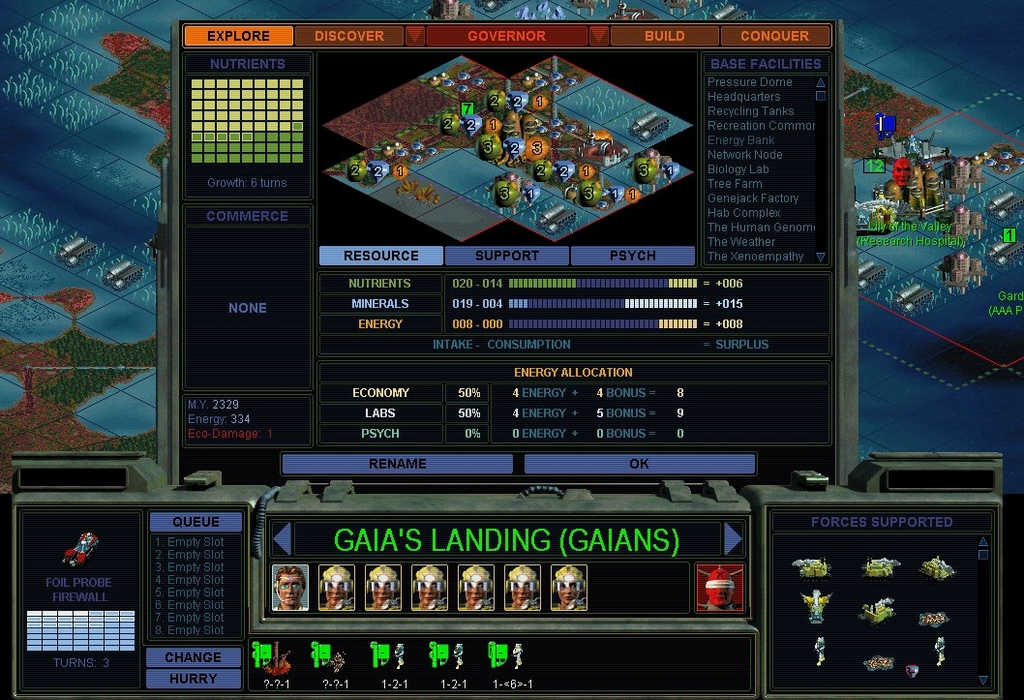 MY 2331.  I do not need to be particularly PLANET friendly at the moment.  Perhaps I can get my conquered bases to grow to size 14.  I will need Socialist to do that, which means I need a higher ECONOMY to offset the penalty.  I have plenty of money saved, but I'm concerned that a Market Crash could wipe it all out.  I'm not able to make large amounts of money unless I have mindworm hordes attacking.  I imagine that with more chemical attacks, that will happen in due course.  I could win either by wiping out a lot of bases, or by surviving enough mindworms for long enough, that I corner the energy market as a byproduct.  Either could take quite awhile.  It would be best if I take the Hunter-Seeker Algorithm from Lal, and then steal all his tech.