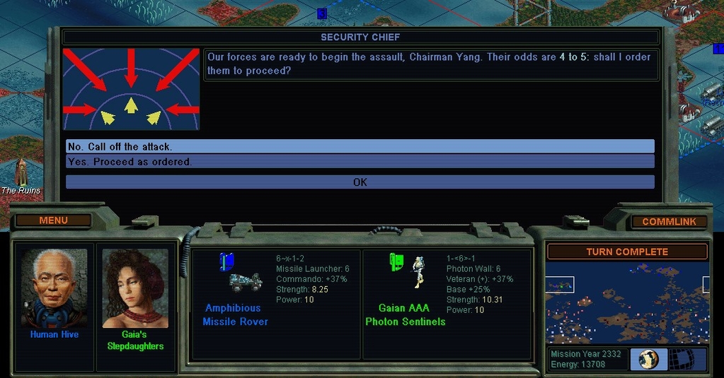 I have 3 healed X Missile Speeders and 1 badly wounded Battle Ogre that I could hit Gaia's Landing with.  Unfortunately I had to use my planes to mop up sea units.  It's not enough force to take the city conventionally, and I think it's too weak to use plagues or chemicals.  I could upgrade my Speeders, and indeed, at the rate the water is rising I'd probably better get this over with.  2 of the defenders however are indigenous units, so I'm not sure my upgraded weapons would do any better against them.  Perhaps if I attack to clear them first?  Let's see what my odds are.