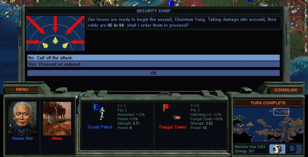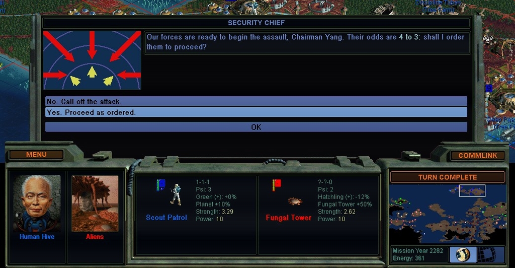 I hit Activate Scenario Editor, then I hit "Y" to turn off God Mode.  So, I can only see what my faction usually sees.  I hit Turn Complete.  The game gets through the inter-turn period just fine.  I go through the cycle of base maintenance operations, just hitting "OK" to get through them faster.  I finally get to the point of having control over my units.  The one that moved onto the fungus is active.  So at least when using A.S.E. there is no bug.
