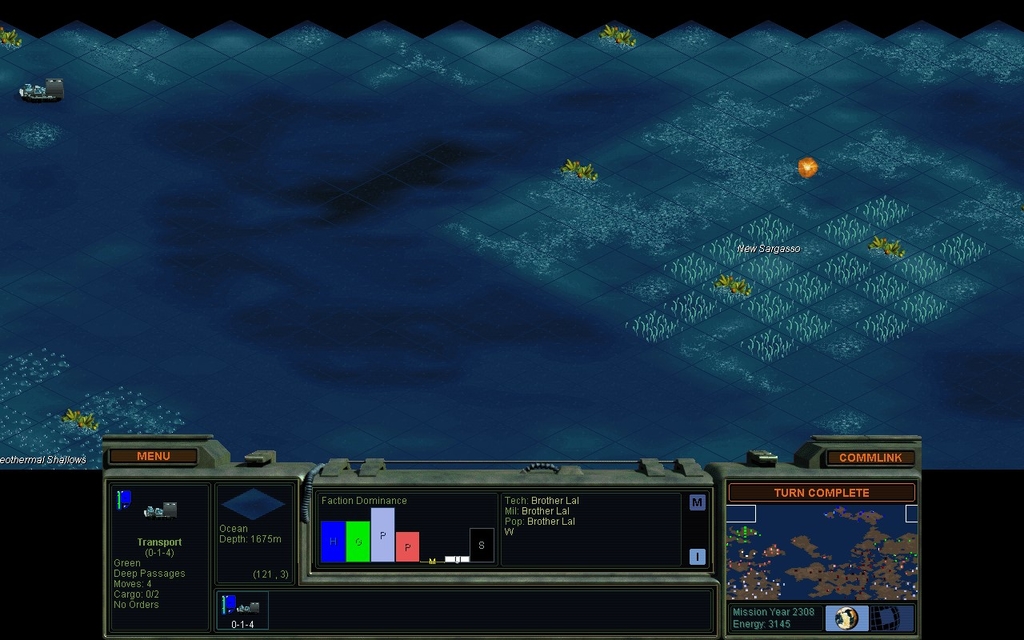 Deidre has only 1 more tech I haven't stolen.  Unfortunately I'm out of cities to steal from.  With the last of my Former units, I drive a rail as near as I can get to a sea base.  I will bring an Elite Amphibious Probe Team to steal from this one.  I cover the fungus with a X Missile Penetrator to make sure I can get through.