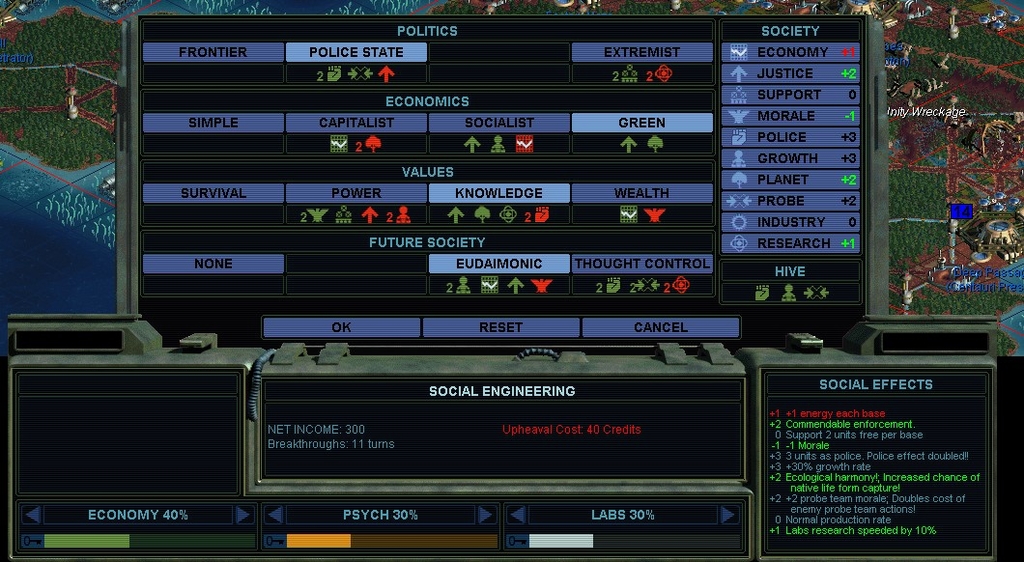 I switch back to Knowledge.  I need all the eco-damage abatement I can get right now.  My worst base is now doing 44.  It's actually not as bad a hit on my money as I thought it would be.  Only like a 15% loss.  I wonder if all the dead mindworms will soon make me rich?  I rush Centauri Preserves in all the cities that don't have them and aren't working on something.  I rush all my pending facilities.  I design an AAA Trance 3-Res Sentinel and start working on one.  All my old Police units, I upgrade to Trance 3-Res Police.  I think I dropped from 6k credits to 3k credits, and that's all I'm going to do.