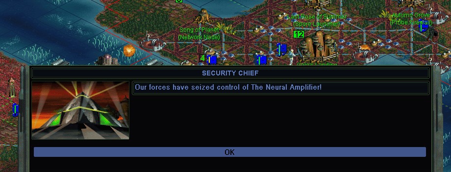 I accidentally plague the site of the Virtual World, because I didn't expect it to be in a smaller unwalled city.  I don't think I can afford the unit distraction to take it this year.  At least, I need to secure the Neural Amplifier first.  I'm noticing that the plagues are so good at weakening units, and the population of some of these bases resists some damage anyways, that I think I could afford to weaken them.  It might save me bothering to upgrade my units.  Yeah, the target's got a Research Hospital, let's kick it in the teeth!