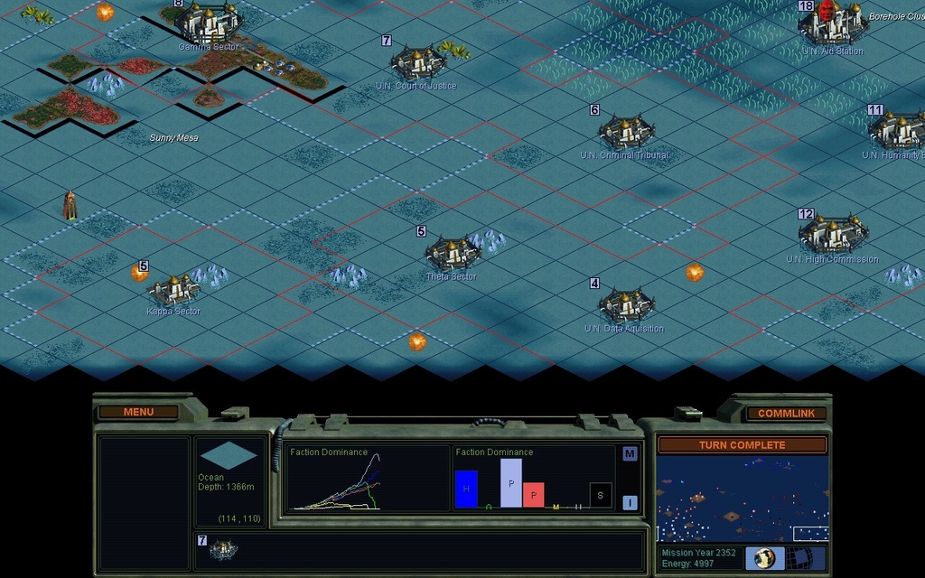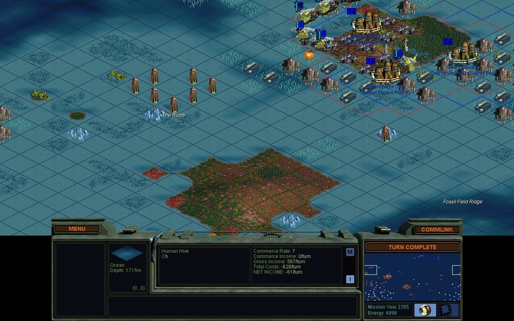 MY 2350.  I've started disbanding my Trance 3-Res Super Cruiser Formers.  They require SUPPORT and they've terraformed everything that doesn't cost money to work on.  I'm not spending any money on terraforming as long as I'm losing money per turn.  I finally caught up with the flooding.  Although my eastern islands still need to sink and be replaced with sea improvements, I'd rather save the minerals and build a modest number of Clean units to work on that.  I may not need it anyways as my bases can still only go to size 14.  I have been stubborn about sticking to my Conquer only focus, even though that's not doing me much good right now.  I have no idea how Lal is doing on tech, but he hasn't started on Hab Domes.