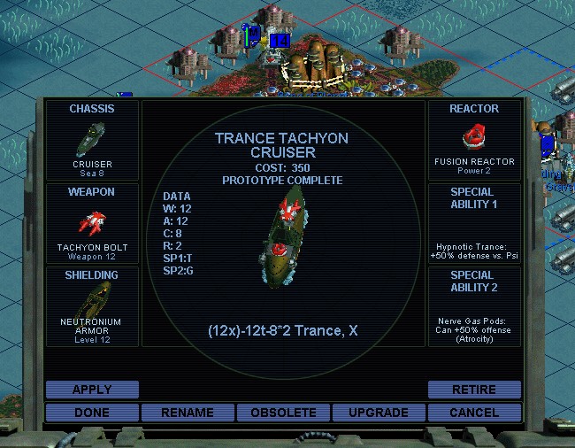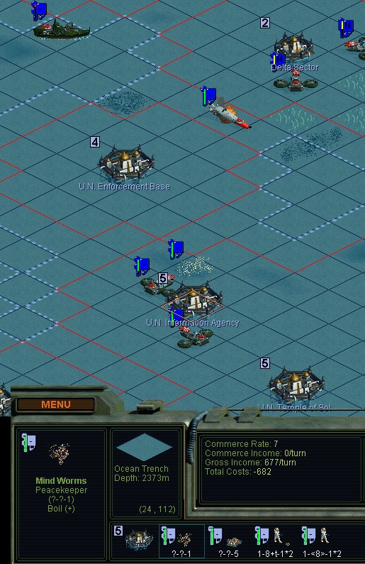 I've got plenty more coming.  Song of Planet is back to having a port again.  I only make these Trance 3-Res R-Laser Cruiser thingies, which are fairly cheap, and defend as well as anything will against Isles.  Their job is to sail past Cultist and Spartan lines, reach Peacekeeper waters, Obliterate captured Peacekeeper bases, and provide garrisons for the few Secret Project cities I keep.  Gravships have been on garrison duty in the interim, and due to the Neural Amplifier, have been holding more or less.