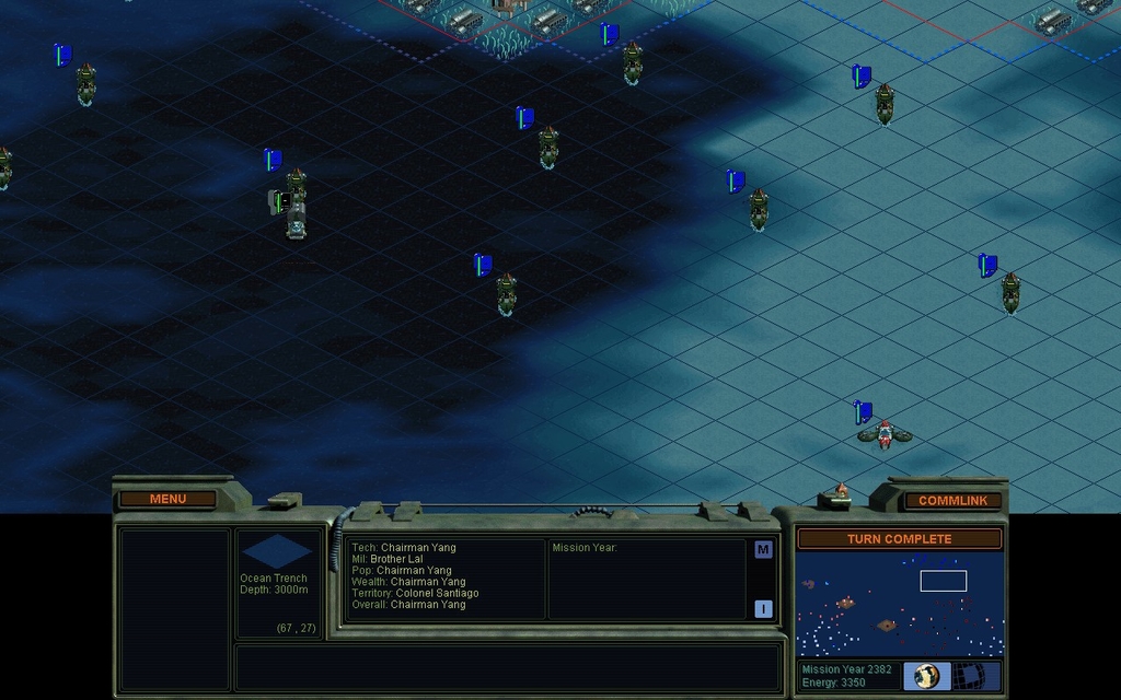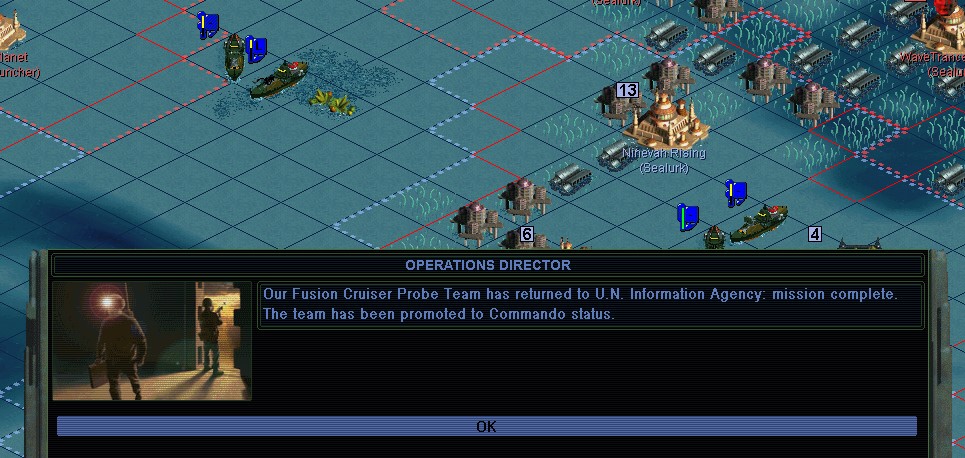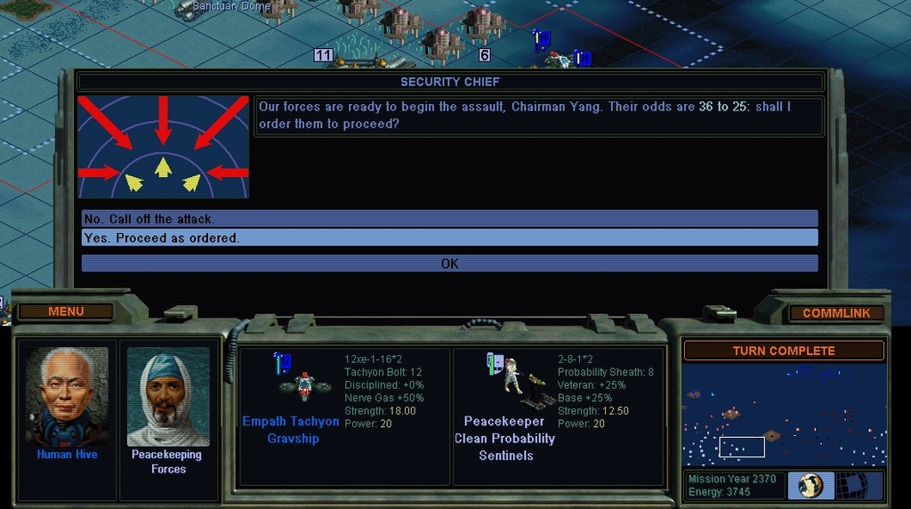 My 2387.  I only have 1 probe team in the vicinity of my conquered Peacekeeper bases, and it wasn't in range of a target this turn.  However some Conventional Missiles arrived and I was able to take yet another Secret Project.  Lal only has 2 more cities containing them.  An irony of cities I've conquered with plagues, is I actually need a ship to Obliterate the last occupants.  A gravship won't do it, it only Bombs when you press 'B'.  It also terminates its movement when it enters a base, so that was frustrating with 2 or 3 units until I figured out what I was doing wrong.  The ships I sent to the region, got badly chewed up by Isles but not killed.  So they're moving very slowly, and they need gravship escort to keep the Isles off.  But finally, they are getting into theater.