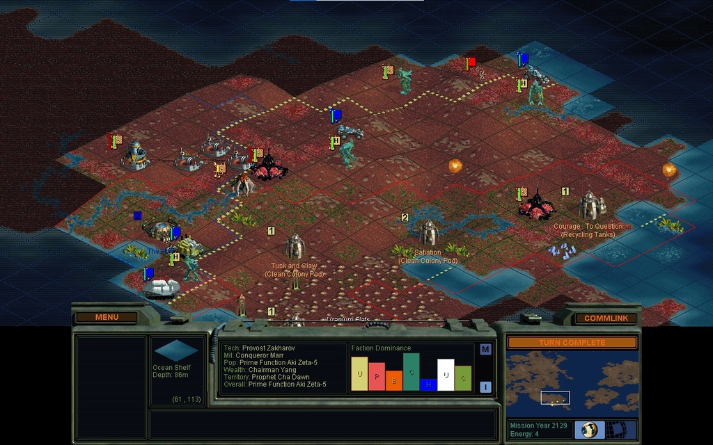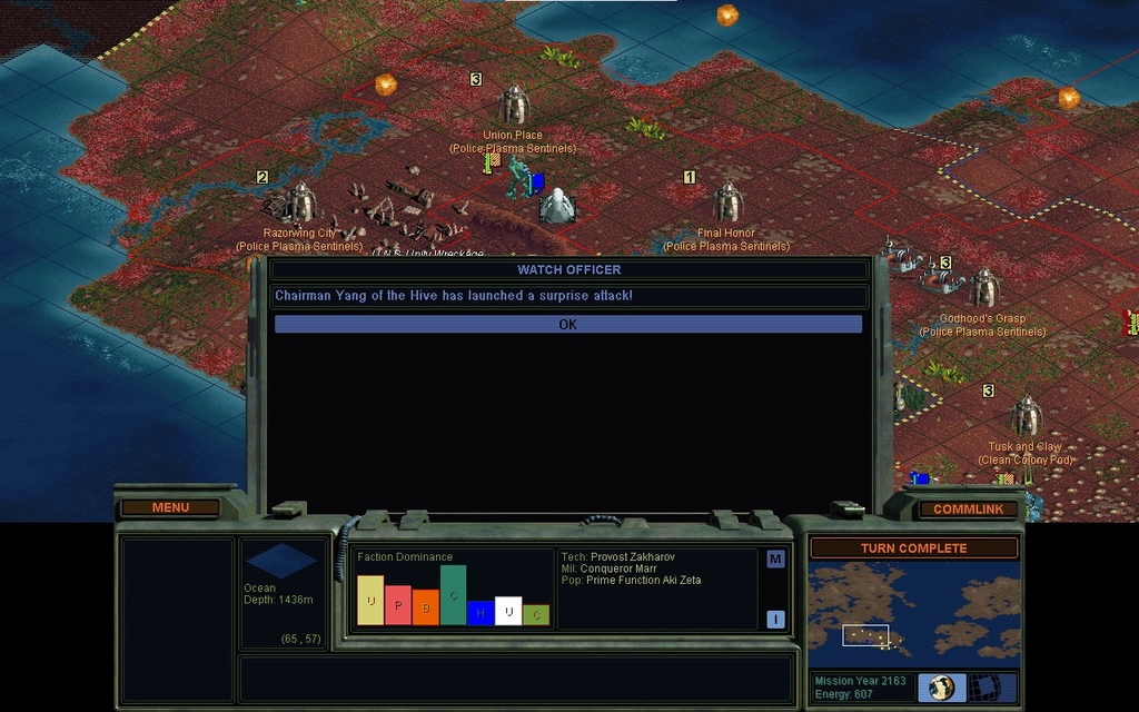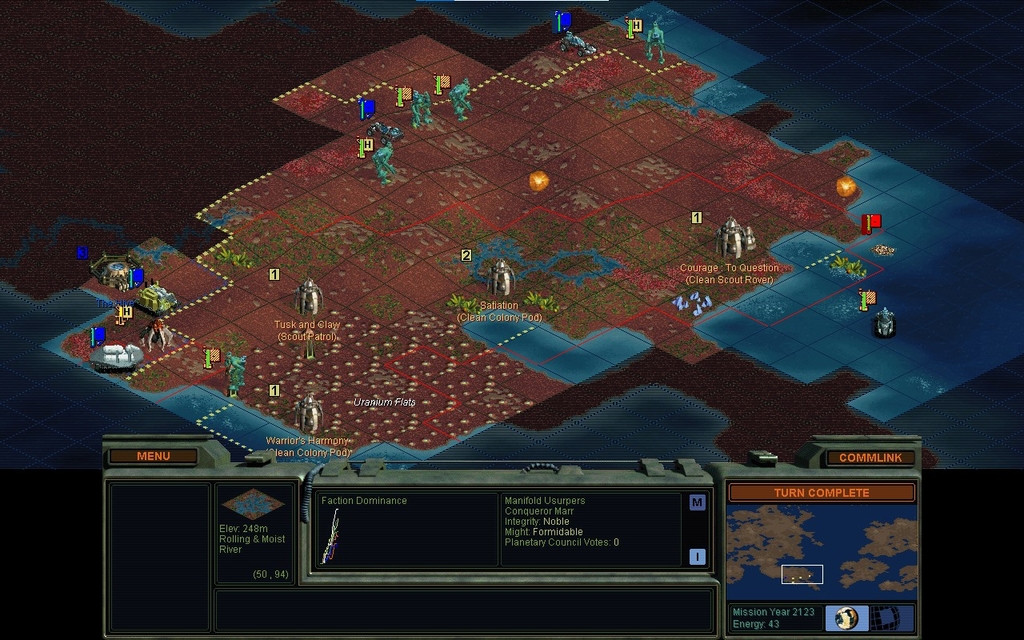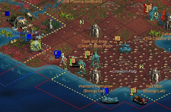 Their colonist finally managed to escape my pinning. But I think it is too late for them. I think I've got them contained by my own land claims. And if it comes to open war, I've already researched C2 Applied Physics! That comes complete with Nerve Gas Pods if I want them. I haven't completed any prototypes yet, but basically they don't stand a chance. Only some other human faction could save them. Or the Caretakers suddenly showing up, but I very much doubt that. Way too much land mass for that to be plausible.