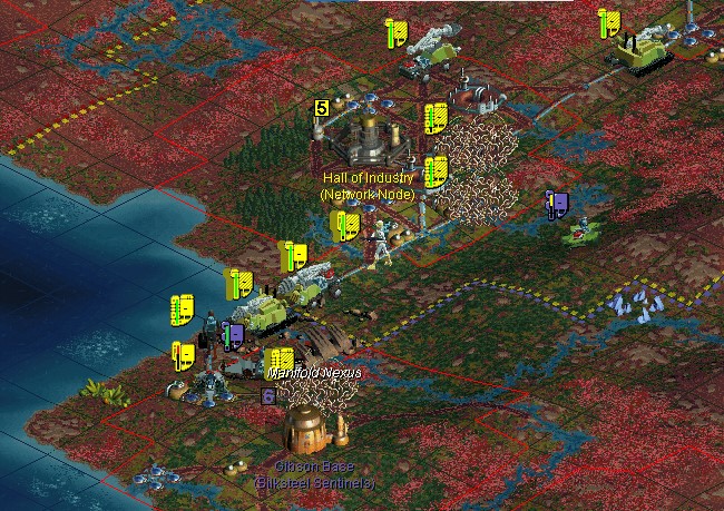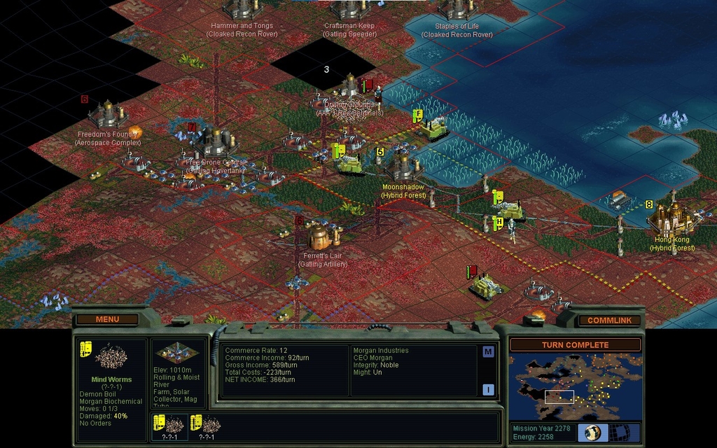 Heck I'm so PLANET friendly now I could go Capitalist if I wanted to.  How much money would it make me?  Hm, only a pittance more.  I guess JUSTICE is important, and I lose 1 point if I ditch Green.  Oh well, we'll keep the mindworms tough and invincible.  In the excitement I forgot to kill a couple of Roze's units.  I dial her up with an acoustic modem, just to razz her.  BEEEEyong-BONG.  CSSSSSHhhhSSSSSHHhhhh.