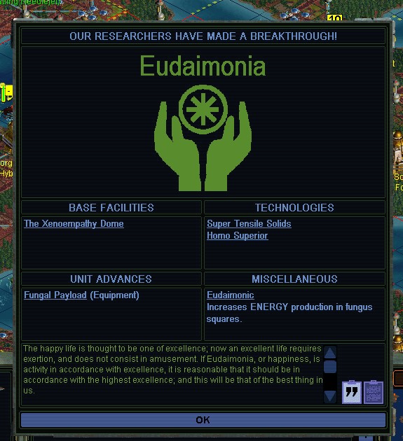 If I go Eudaimonic, my mindworms will kick even more butt, and I can pop boom in all my major cities.  I'll earn Cha Dawn's undying devotion, and Roze and Aki Zeta5's eternal emmnity.  That suits me fine!  All it costs me is my POLICE.  Well I think I can handle that, I've got piles of happiness infrastructure that I'm barely taxing in the name of making money.