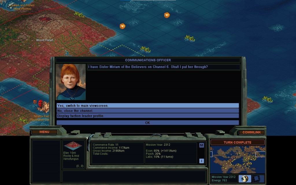 MY 2313.  I complete my Tectonic Quantum Missile prototype.  Where can I make the most trouble between the Cyborgs and the Believers?  Or are they going to keep up this charade of being such eternal close friends?  Missiles in my mod stay aloft a very long time and can hit anything on even a Giant map, but it does take time to get there.  This turn, I can only hit the point of land just southwest of Godwinson's Hope.  I believe hitting just south of that base, would landlock both the Cyborg base Gamma Flats and the Believer base Consecrated Waters.  On the other hand, it would also create direct rail access straight to Morgan Chickenscratch.  That's not actually what I had in mind.  I want Miriam to go fight the Cyborgs, not me.  So I will grudgingly wait until next turn to fire this thing off at closer range.