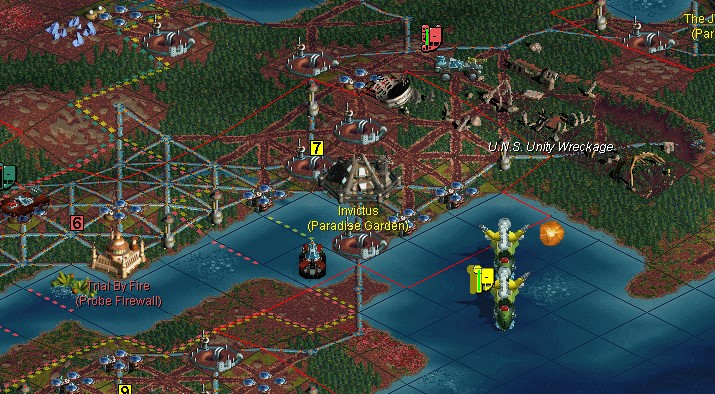 I want to dig a canal to The Jeneba Complex so that I can improve the sea squares of the 2 bases up there.  I start using excess land Formers to lower the land south of it, while my Sea Formers dig the canal.  I tried to dig at the Energy special, but bizarrely, the game told me that would mess up Gaian territory.  That doesn't make any sense as they don't own that water, it's international.  Nor do they own the coastal land, it's mine.  Well whatever.  That entire coast, gave me the same error message.  So I had to dig on the other side of the peninsula, and part of the Unity wreckage was a casualty that.  Guess any school field trips are gonna need scuba gear!